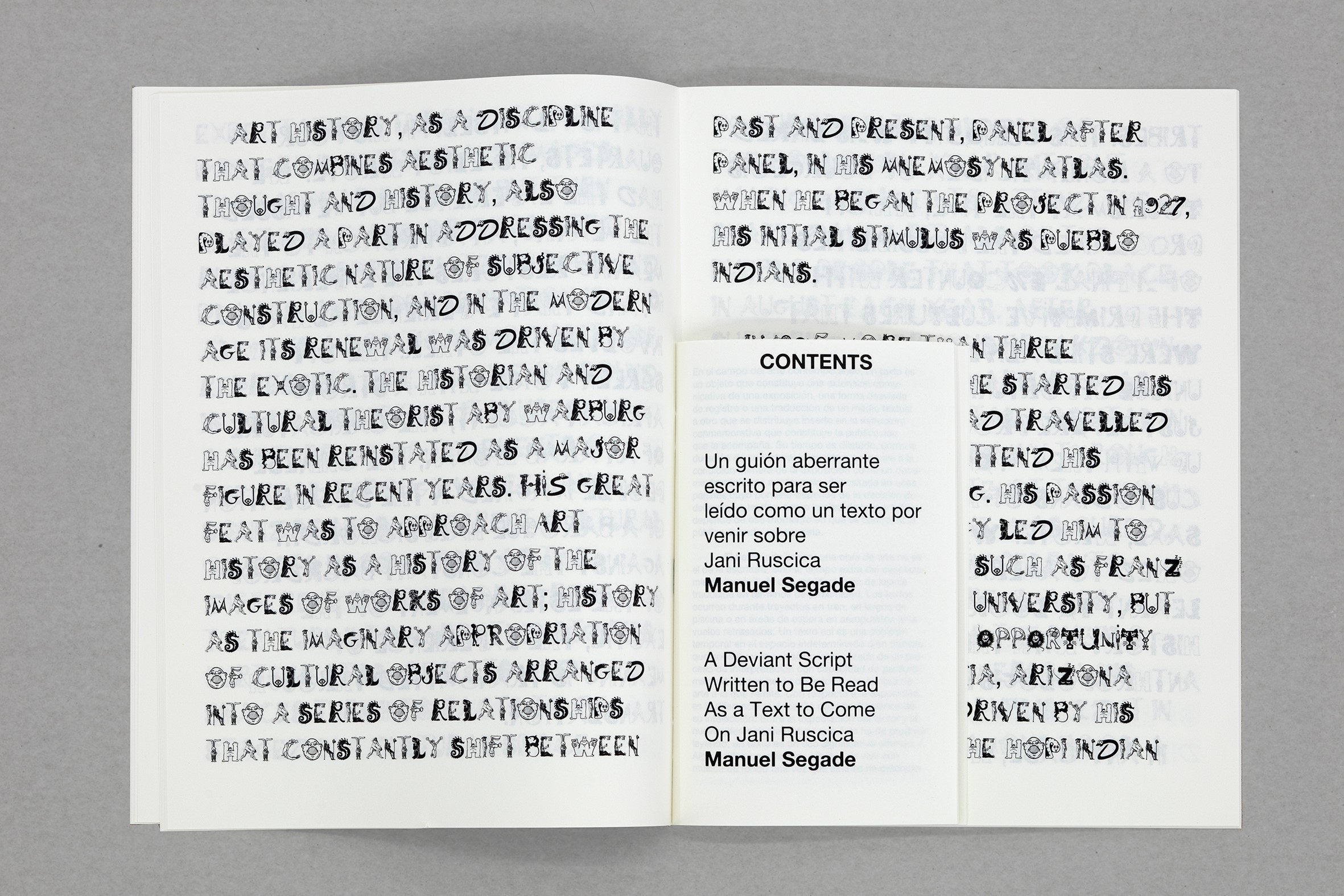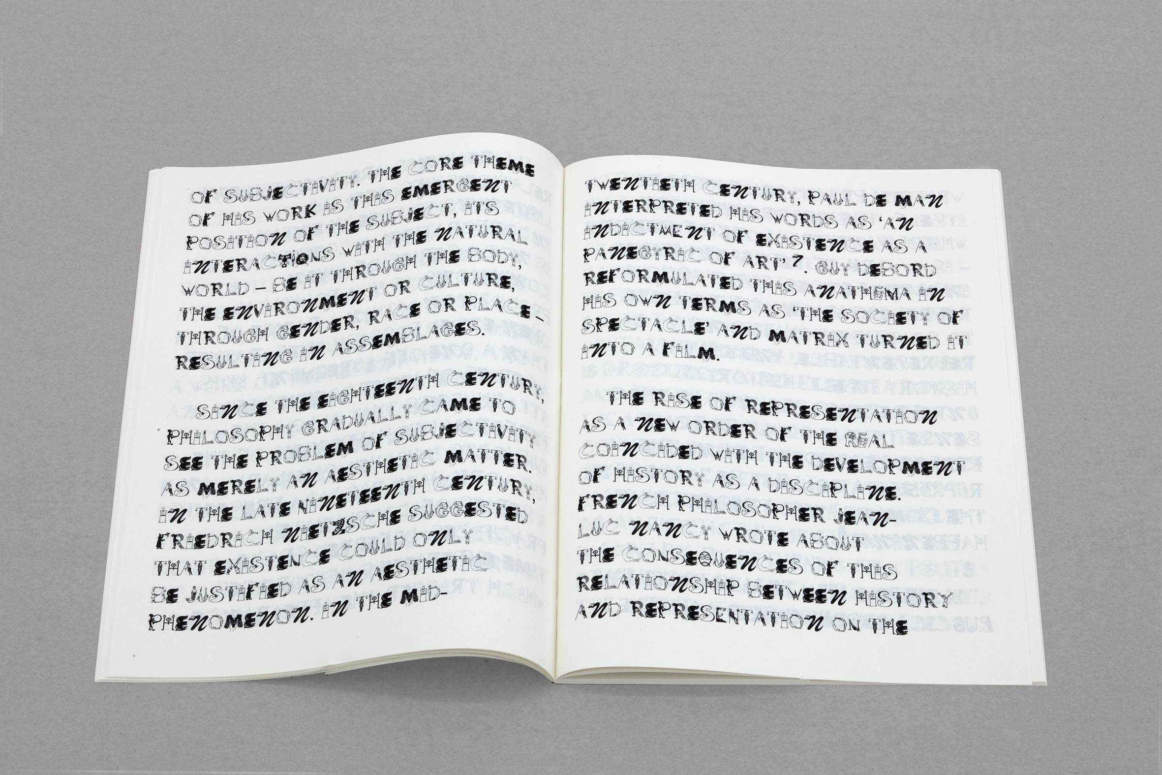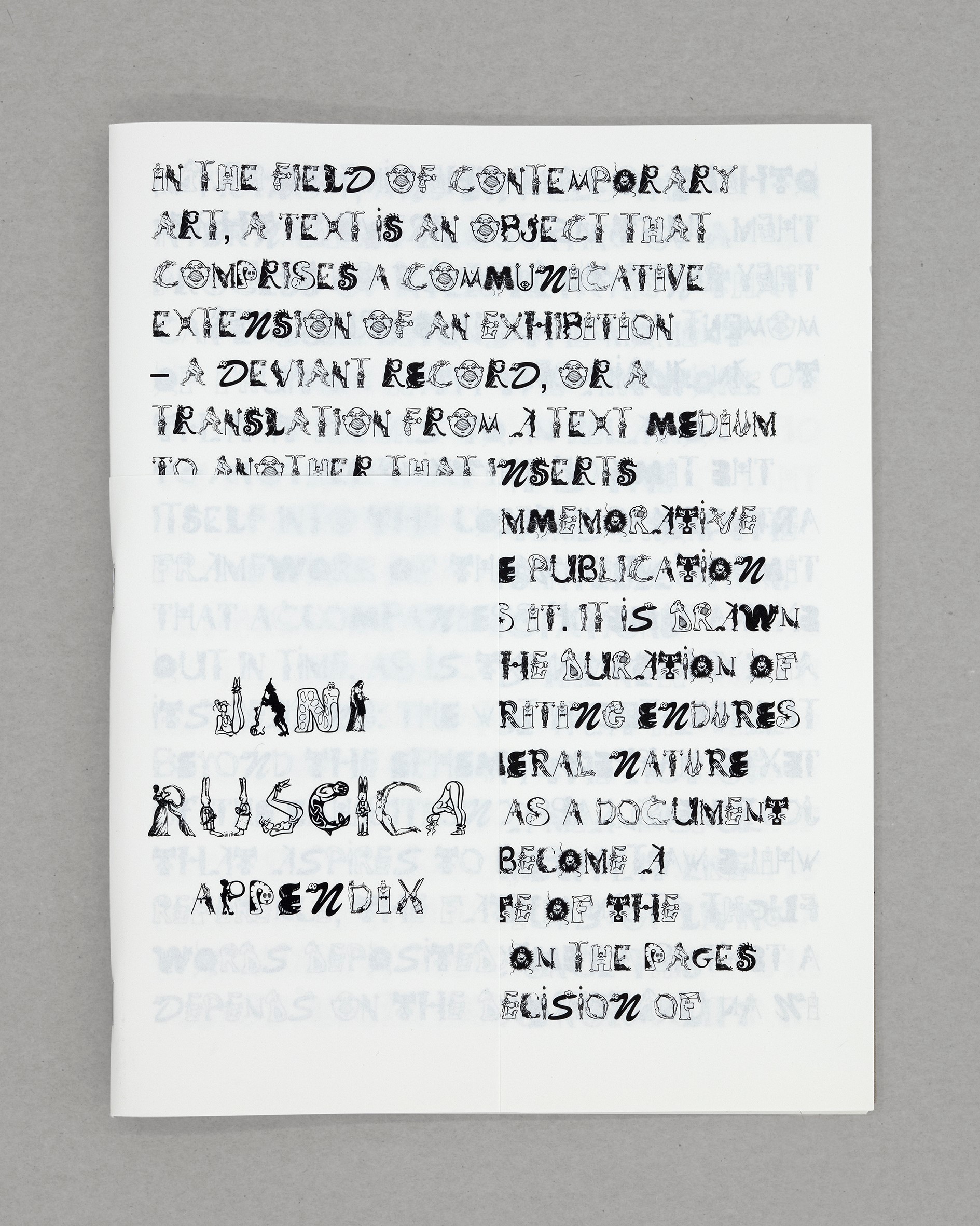 Appendix is an artist book developed in collaboration between Finnish artist Jani Ruscica and CIRCA Projects. Considered as an appendix to Ruscica’s major new project ‘Conversation in Pieces’, the book features a specially commissioned text by Madrid-based curator Manuel Segade, ‘A Deviant Script Written to Be Read As a Text to Come On Jani Ruscica’, printed in both English and Spanish and typeset in a collaboratively created anthropomorphic typeface.