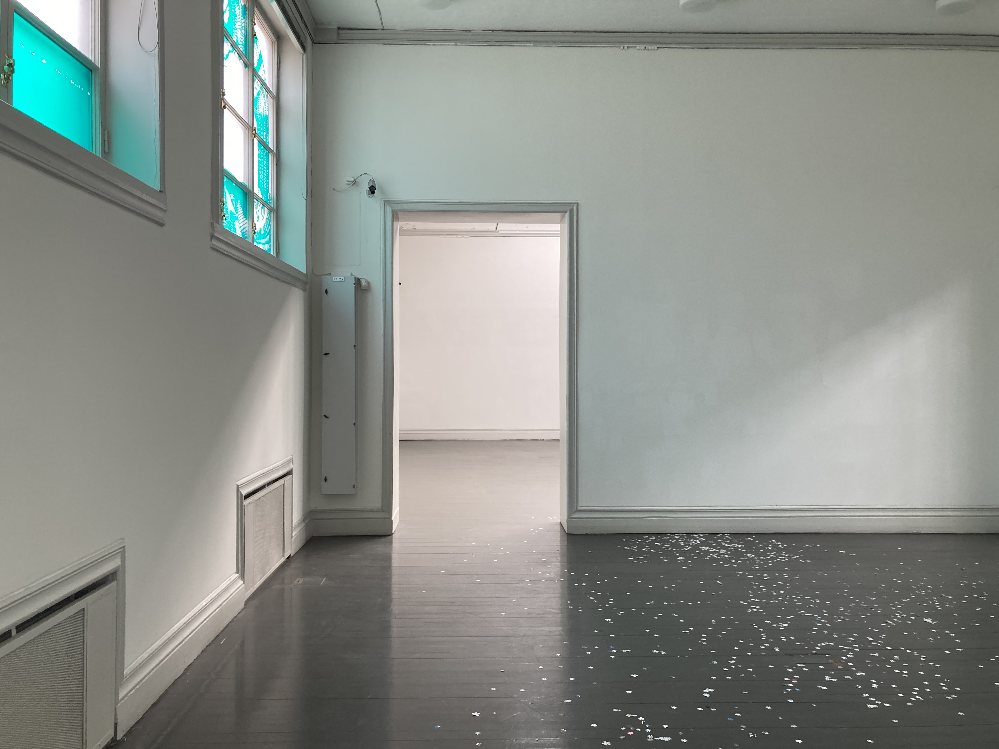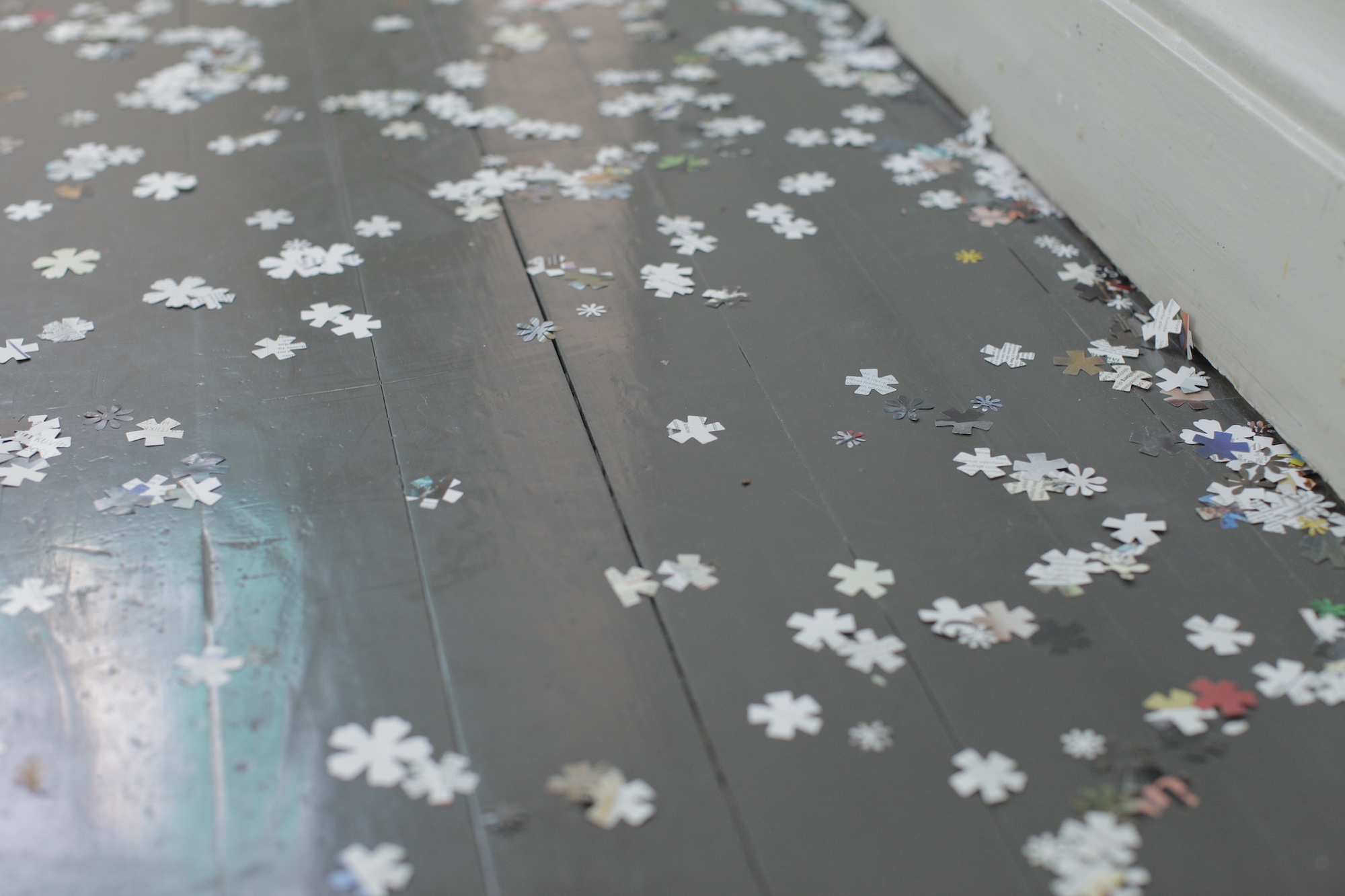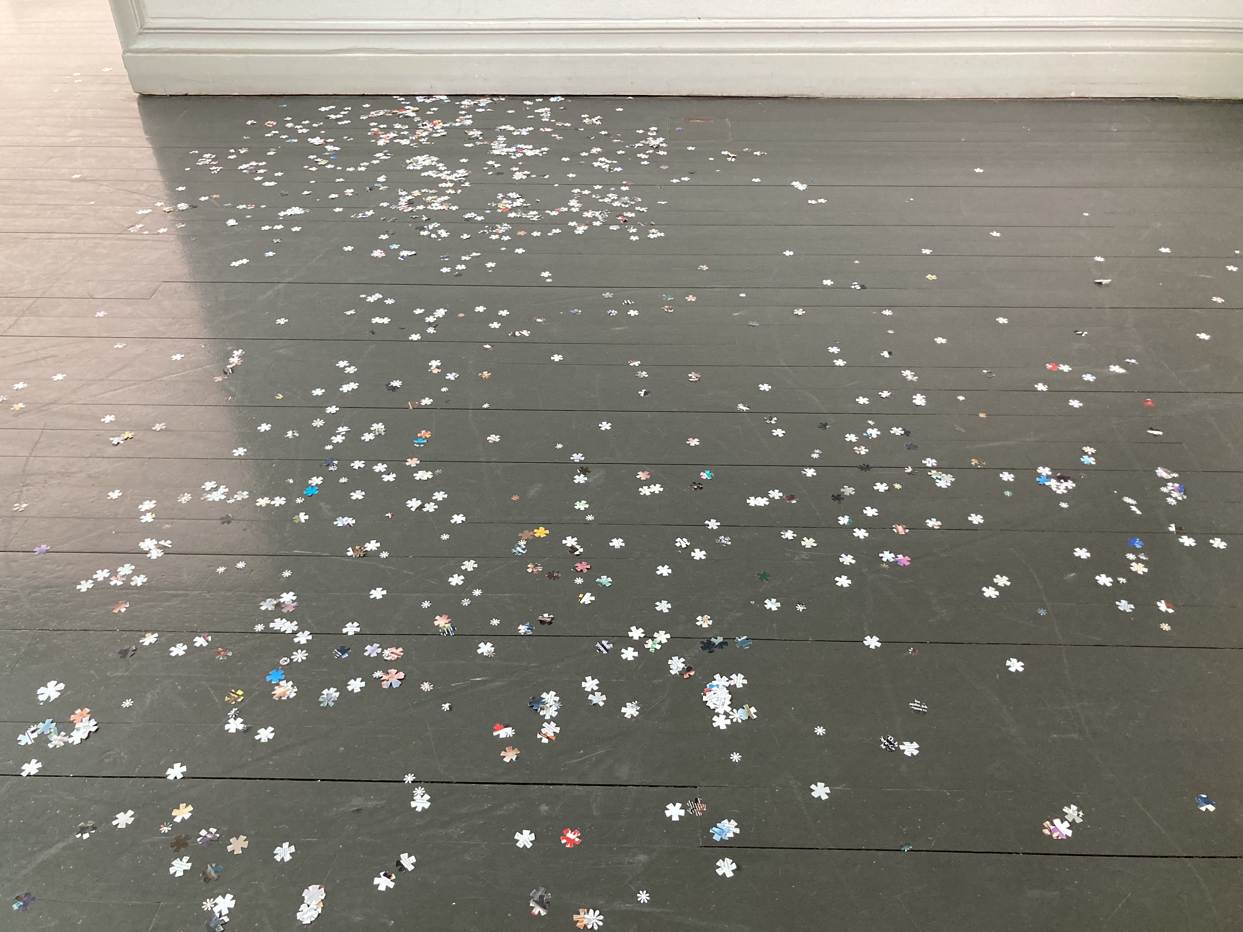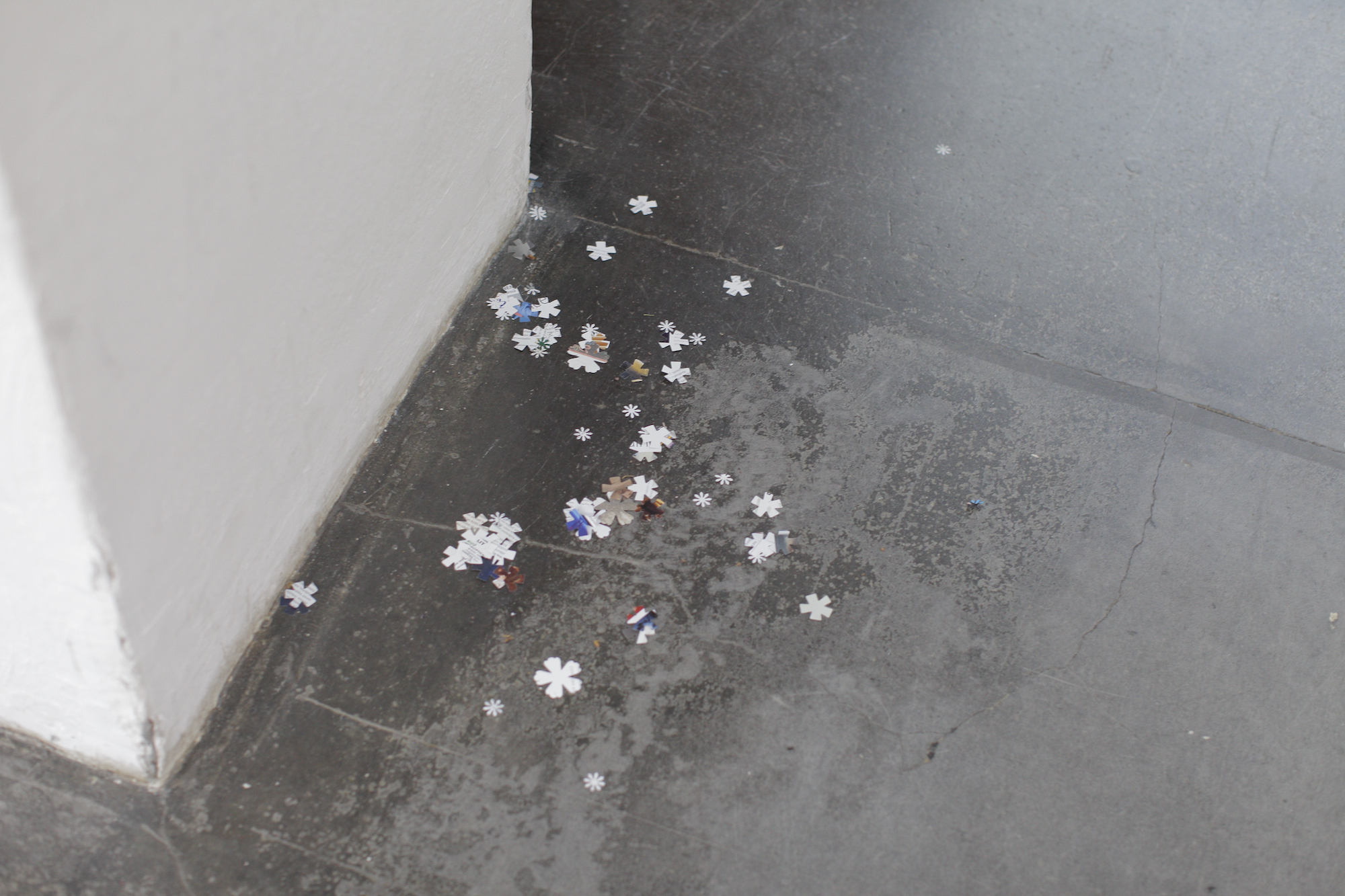 Confetti made in different, freely associative shapes, is scattered across the exhibition space, moving fluidly, as it pleases.